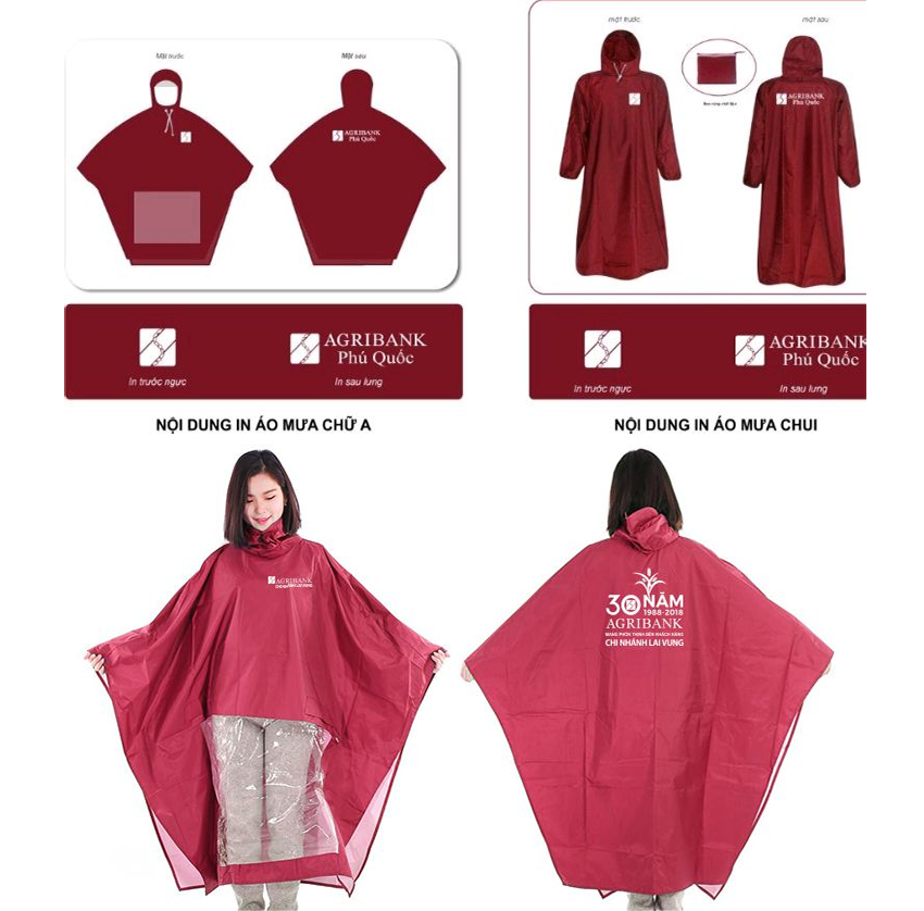 Áo mưa in logo là tên gọi chung của các sản phẩm áo mưa được in ấn theo thiết kế riêng. Vì thế không chỉ có logo công ty mà người ta còn in số độ thoại, tên trang web, slogan, tên sản phẩm hay thông tin liên hệ. Thông thường logo công ty sẽ được in ở phần trước ngực áo mưa với kích thước từ 10-10cm và phấn sau lưng áo mưa sẽ được in tên công ty, số điện thoại, Website và một số thông tin liên hệ hoặc nội dung thông điệp muốn truyền tải với kích thước lớn. Đường kính trung bình của hình ảnh được in sau lưng áo là từ 40-50cm, với một kích thước lớn như vậy thì áo mưa tỏ ra rất có lợi thế khi gây được sự chú ý của nhiều người.